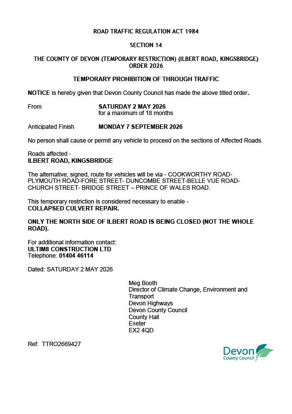Information about the culvert works and the one-way system is available on Devon County Council’s web page: https://www.devon.gov.uk/roads-and-transport/traffic-information/roadworks/kingsbridge-fore-street/